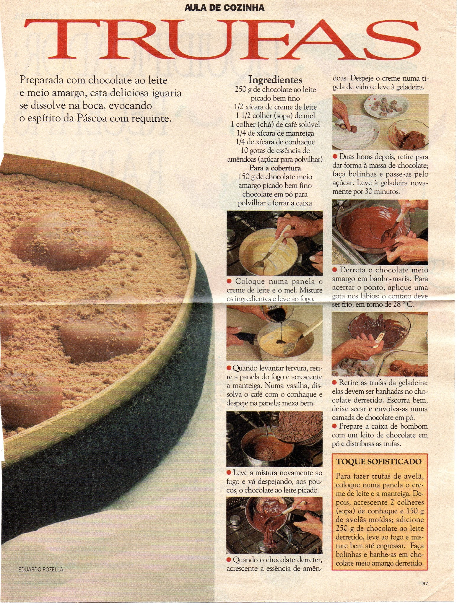 Vasculhando hoje pela manhã o Acervo de D. Sarah dos Santos Lima Rocco, encontrei ótima receita de trufa, publicado originalmente na Revista Manequim, em abril de 1994. Na época a publicação tinha uma seção chamada “Aula de Cozinha”, onde as leitoras recebiam todos os meses receitas tradicionais. Vou reproduzir abaixo a receita, como no original.